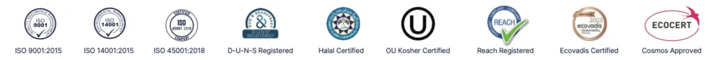 提供具備 ECOCERT、COSMOS、ISO 等認證的高標準原料。